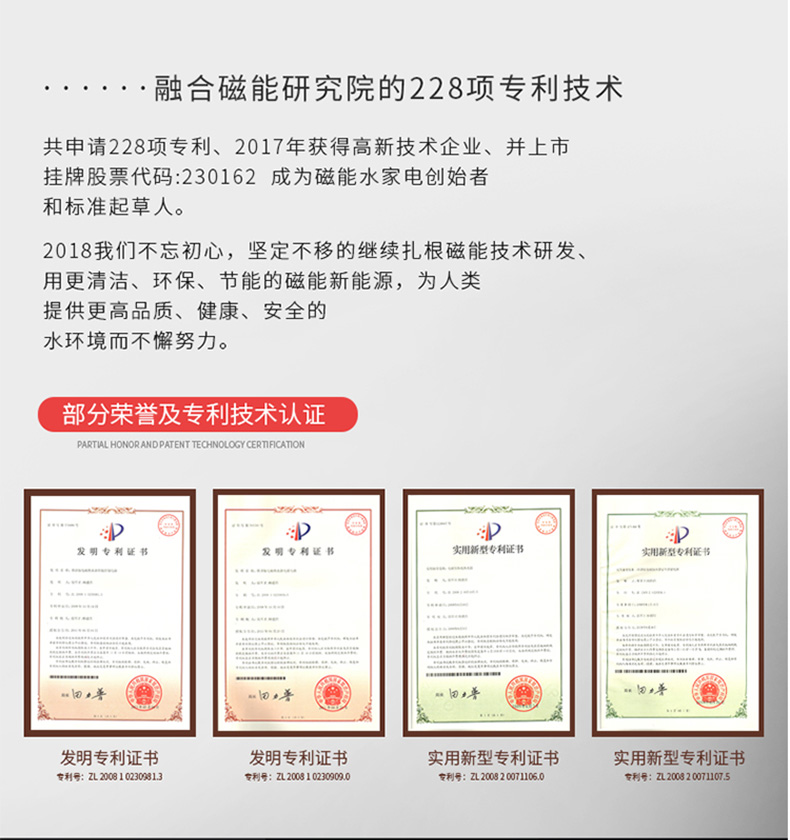 公司07年已經(jīng)提出了“磁能健康水家電”的產(chǎn)品概念,08年巨資引進德國工業(yè)級和食品級磁能技術(shù),經(jīng)過多年嚴謹?shù)募夹g(shù)開發(fā)和反復(fù)實驗...【查看更多】