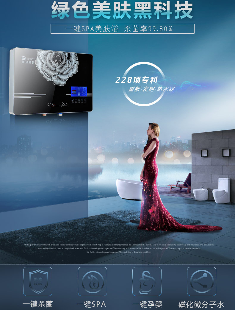 斯瑞斯特電磁能熱水器是通過電轉(zhuǎn)換成磁能隔空傳輸加熱,不存在漏電,不需要防電,,當(dāng)今真正安全的熱水器。它具有導(dǎo)熱快,出水大,能磁化自來水的作用。所有流經(jīng)速磁熱水器的自來水被超強(qiáng)磁力線切割成數(shù)千億個(gè)納米水團(tuán),成為弱堿性小分子團(tuán)的高性能活性水,并有效保留原水中對(duì)人體有益的微量元素和礦物質(zhì),給人們呈現(xiàn)真正安全和健康的熱水。這么好的恒溫安全的家用電磁能熱水器,難道您還拒之門外嗎?