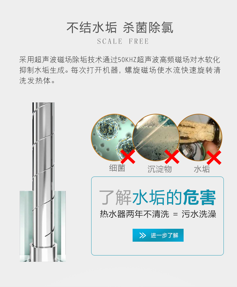 除了自來水水質問題外,使用老舊的電熱水器也有大問題:據新聞報道,有維修師傅打開老舊的電熱水器,發(fā)現里面的骯臟觸目驚心,除了銹跡斑斑的鎂棒、內膽厚厚的水垢,最吃驚的是,內膽表層發(fā)黑,細菌已經長期繁殖。扭開排污口,還涌出一灘污水來,這些污水長年累月積攢了多少病菌,想想都心驚膽戰(zhàn)。用這樣的水拿來洗澡,談何健康呢?所以說,想要健康沐浴,擁有一臺能夠除垢殺菌的熱水器顯得十分必要。