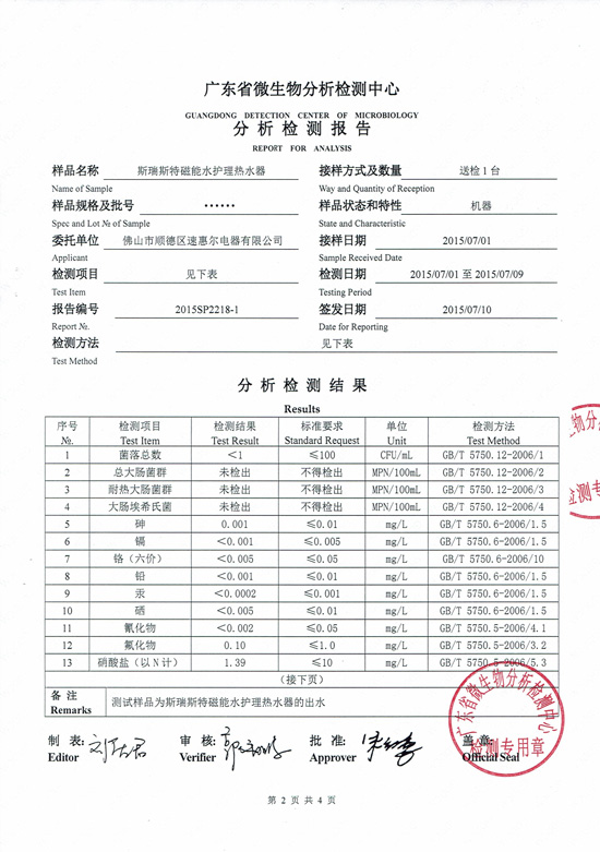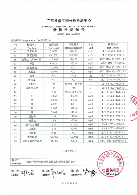 斯瑞斯特磁能熱水器不只是單純給生活用水進(jìn)行加熱,更主要能明顯提升水質(zhì),通過(guò)檢測(cè)中心的水質(zhì)苛刻檢測(cè),經(jīng)過(guò)斯瑞斯特磁能熱水器入門級(jí)產(chǎn)品小廚寶加熱出來(lái)的水質(zhì)符合并超越直飲水的標(biāo)準(zhǔn)。以下是水質(zhì)檢測(cè)報(bào)告文件: