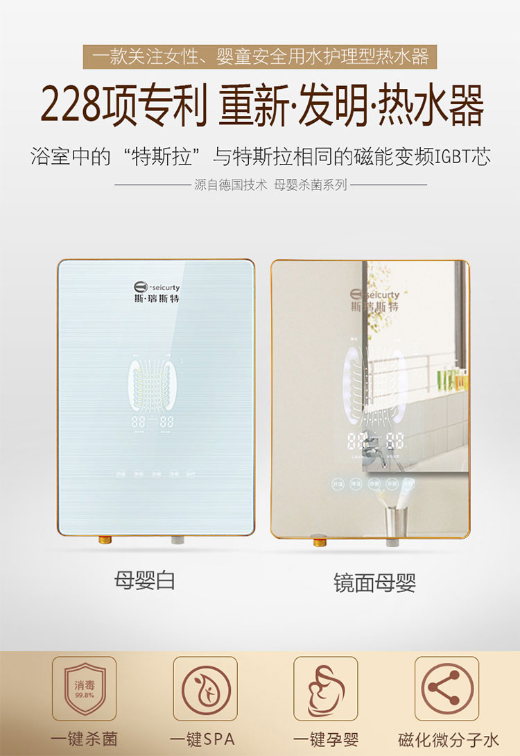 斯瑞斯特磁能熱水器的好用之處在于實(shí)用的功能和貼心的機(jī)型設(shè)計(jì)。斯瑞斯特?fù)碛卸囗?xiàng)專(zhuān)利技術(shù),熱水器的一些實(shí)用功能設(shè)計(jì)運(yùn)用了這些專(zhuān)利技術(shù)的一部分,因此斯瑞斯特?zé)崴鞯膸追N功能是獨(dú)一無(wú)二的。脈沖磁場(chǎng)殺菌、水質(zhì)磁化和自動(dòng)反沖洗水垢功能皆是專(zhuān)利技術(shù)的應(yīng)用,這些功能可以讓水體發(fā)生良好的改變,保證了加熱后所出的熱水都是有益、無(wú)菌無(wú)污染的。除了這幾個(gè)功能外,斯瑞斯特?zé)崴鬟€帶有孕嬰和水療功能,孕嬰功能自動(dòng)調(diào)節(jié)合適溫度,方便各位父母幫嬰兒洗澡;使用水療功能夠促進(jìn)身體血液循環(huán)、新陳代謝、放松肌肉、軟化軟組織。