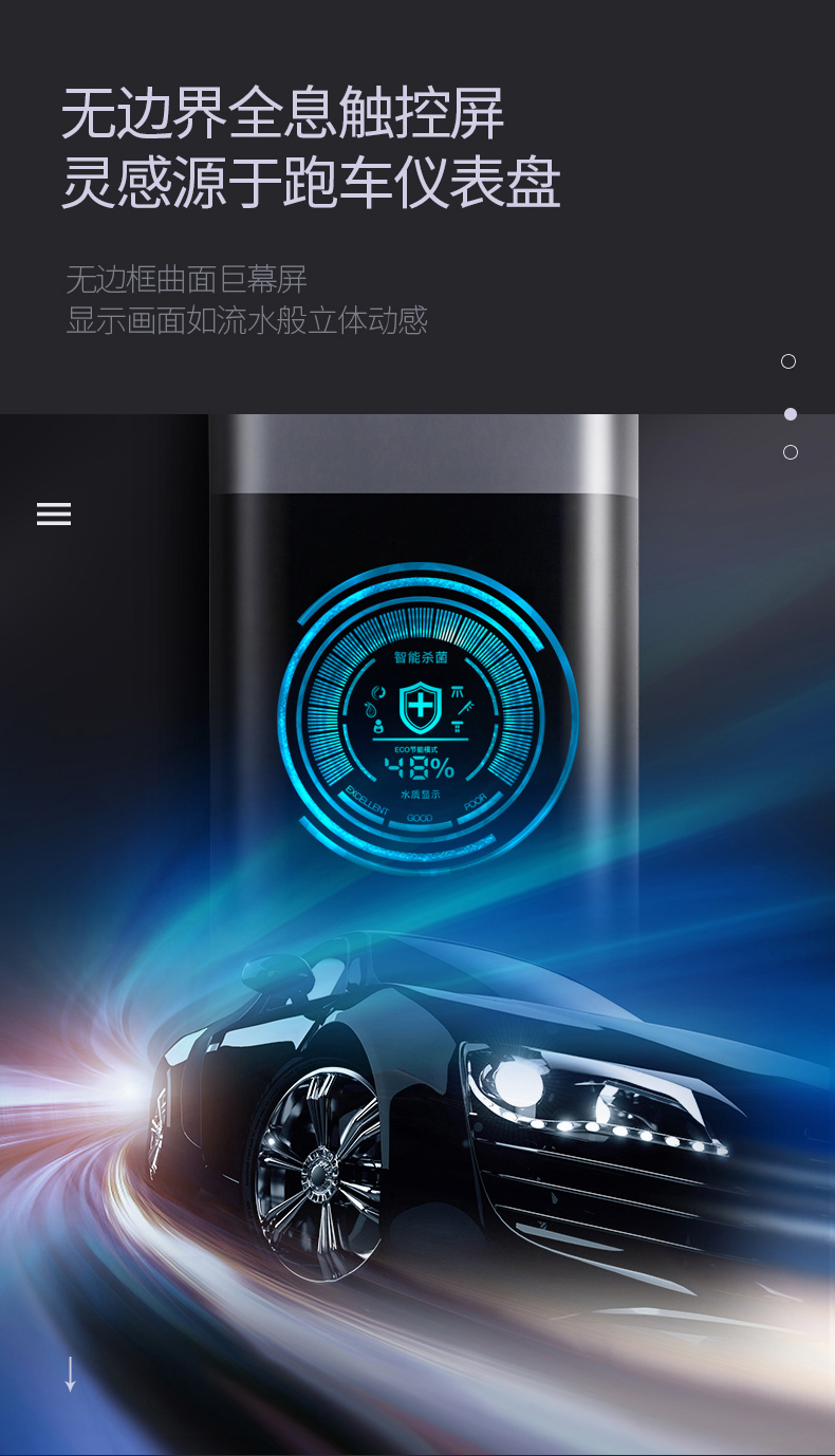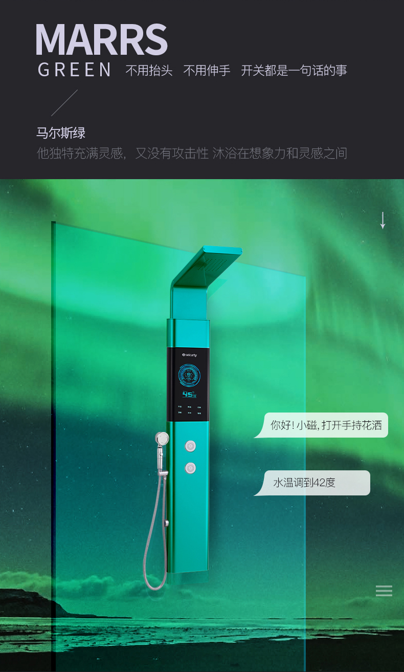 無邊界全息曲面觸控屏,未來“觸”手可及。淋浴屏的這塊無邊界全息曲面觸控屏,靈感源于跑車儀表盤,高端大氣且極具科技感;無邊框的巨幕曲面屏,顯示畫面如流水般立體動(dòng)感;高靈敏度曲面屏保證沾水后也能精準(zhǔn)響應(yīng)操作指令。