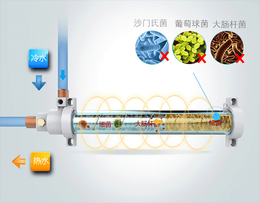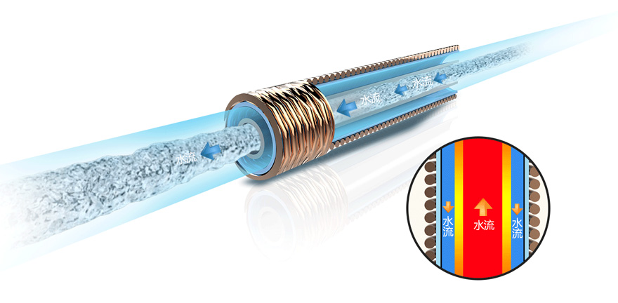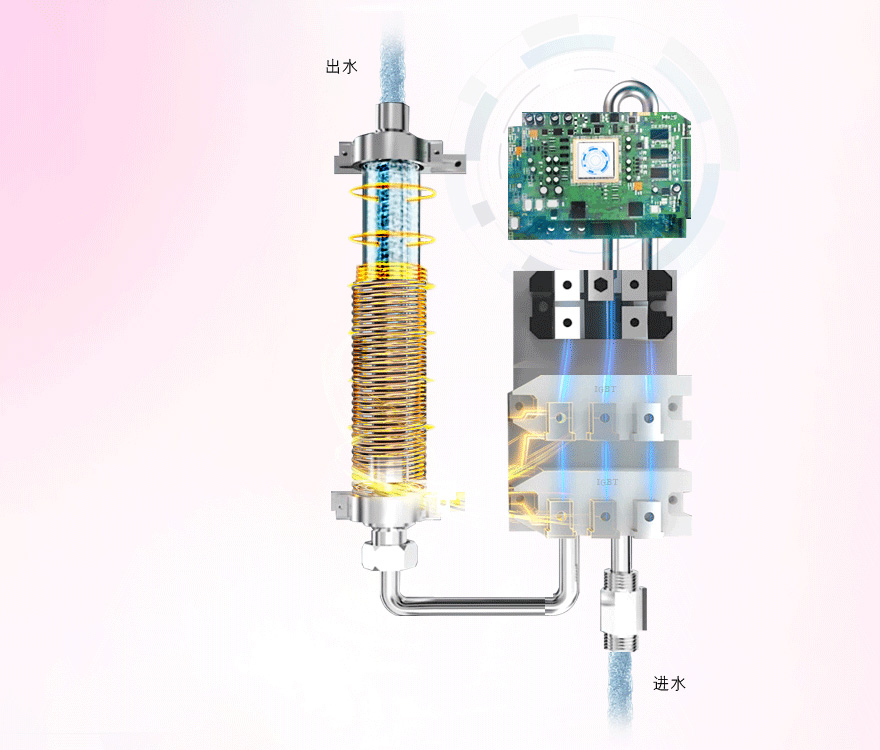 從冷水進至熱水出,水不接觸電,整個過程隔空感應式加熱。